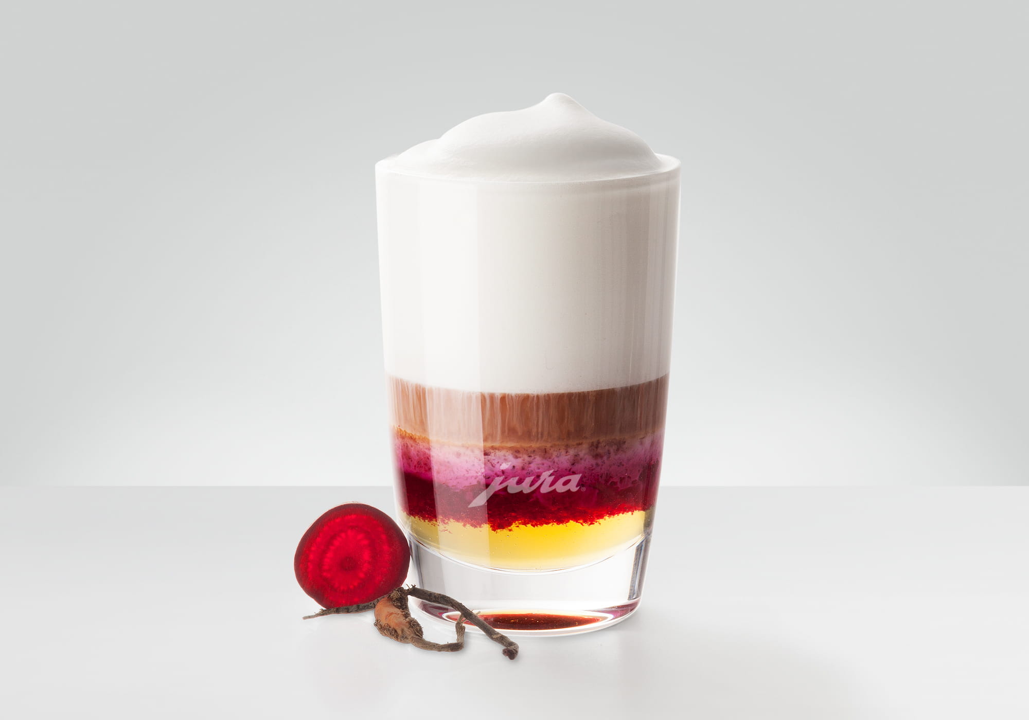将2 勺甜菜根泥、蜂蜜和姜末放入拿铁玛琪雅朵咖啡杯