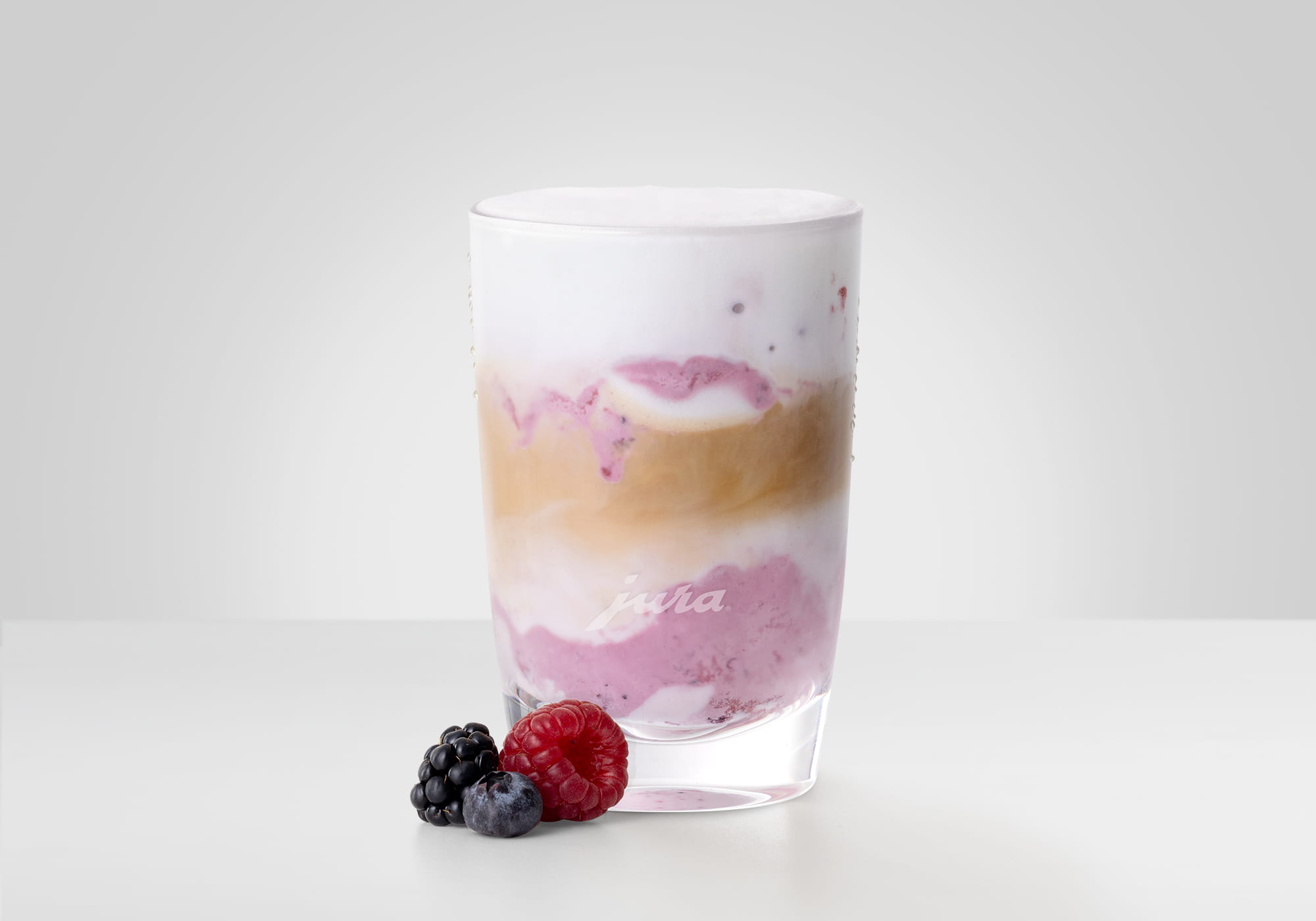 取一个小拿铁玛琪雅朵杯,放入两勺野莓冰淇淋。